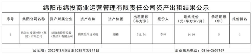 綿陽市綿投商業(yè)運(yùn)營管理有限責(zé)任公司資產(chǎn)出租結(jié)果公示