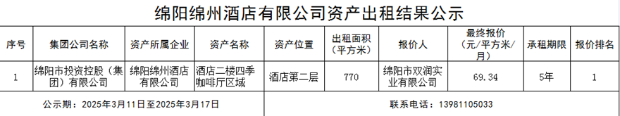 綿陽(yáng)綿州酒店有限公司資產(chǎn)出租結(jié)果公示