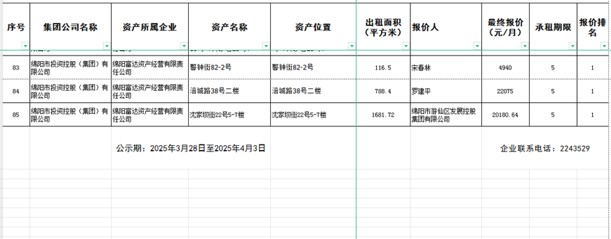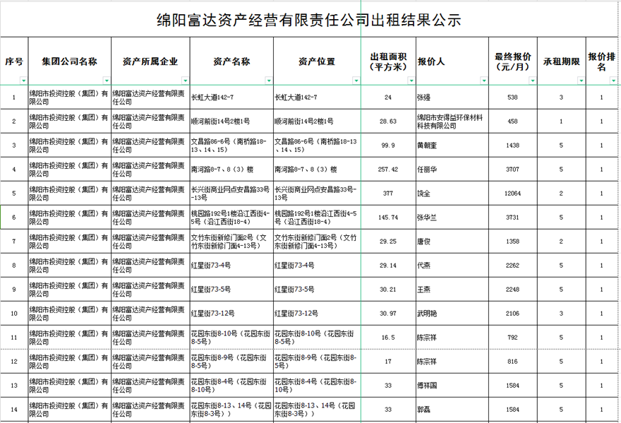 綿陽富達(dá)資產(chǎn)經(jīng)營有限責(zé)任公司出租結(jié)果公示