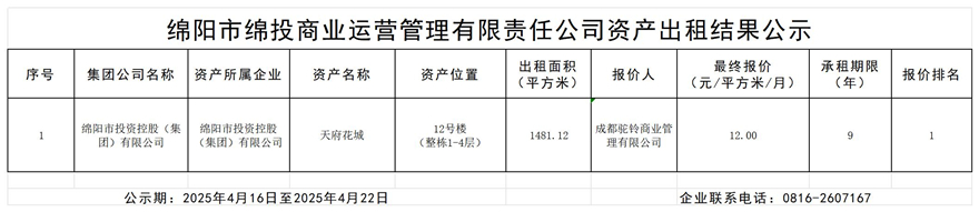 綿陽(yáng)市綿投商業(yè)運(yùn)營(yíng)管理有限責(zé)任公司資產(chǎn)出租結(jié)果公示