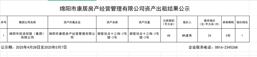 綿陽市康居房產(chǎn)經(jīng)營管理有限公司資產(chǎn)出租結(jié)果公示