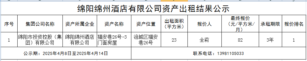 綿陽(yáng)綿州酒店有限公司資產(chǎn)出租結(jié)果公示