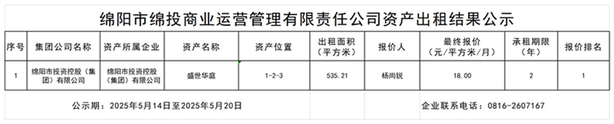 綿陽市綿投商業(yè)運營管理有限責任公司資產出租結果公示