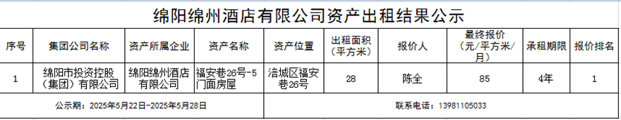 綿陽(yáng)綿州酒店有限公司資產(chǎn)出租結(jié)果公示