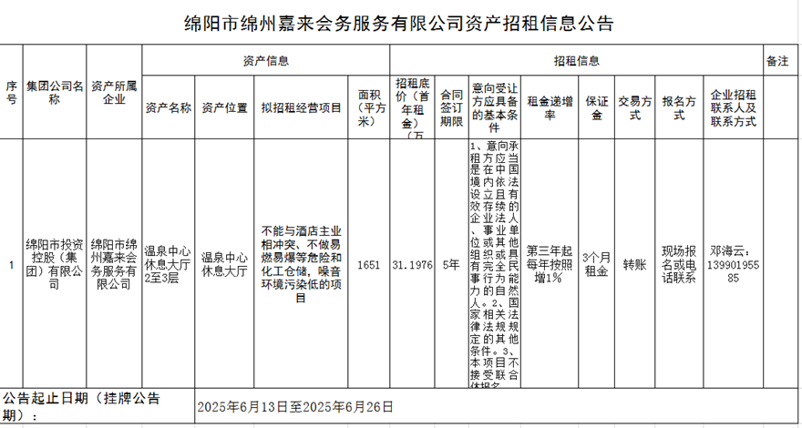 綿陽(yáng)市綿州嘉來(lái)會(huì)務(wù)服務(wù)有限公司資產(chǎn)招租信息公告