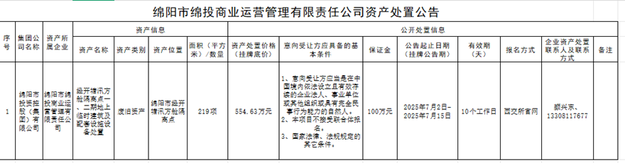 綿陽市綿投商業(yè)運營管理有限責任公司資產處置公告