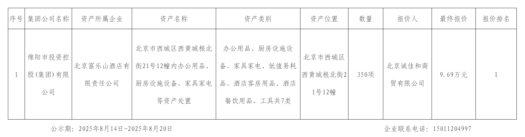 北京富樂山酒店有限責任公司資產(chǎn)處置結果公示