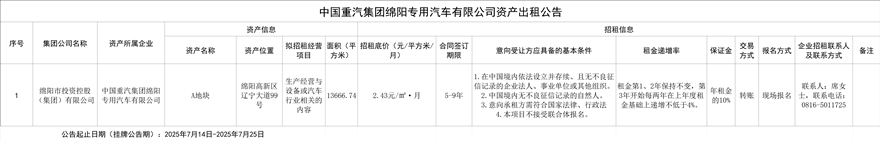 中國重汽集團(tuán)綿陽專用汽車有限公司資產(chǎn)出租公告
