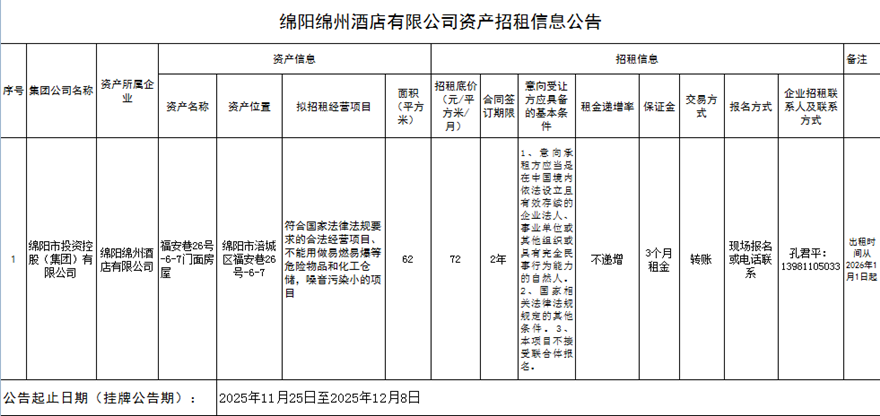 綿陽(yáng)綿州酒店有限公司資產(chǎn)招租信息公告