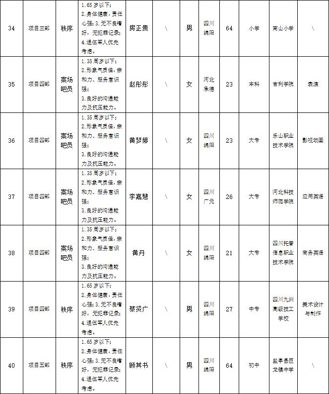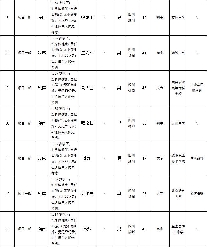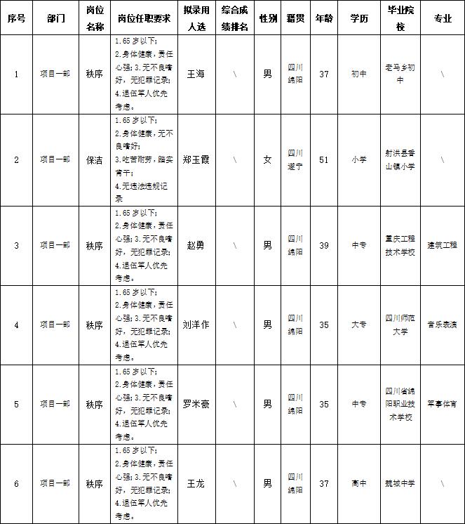 根據(jù)綿陽(yáng)市康來(lái)物業(yè)服務(wù)有限公司發(fā)布的招聘公告及招聘相關(guān)規(guī)定,經(jīng)面試等程序,擬錄用以下人員到各項(xiàng)目部工作,現(xiàn)予以公示,具體情況如下:
