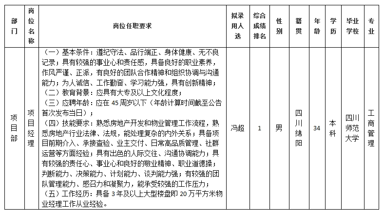 根據(jù)綿陽(yáng)市康來(lái)物業(yè)服務(wù)有限公司發(fā)布的招聘公告及招聘相關(guān)規(guī)定,經(jīng)筆試、面試、背景調(diào)查等程序,擬錄用馮超同志到綿陽(yáng)市康來(lái)物業(yè)服務(wù)有限公司項(xiàng)目部工作,現(xiàn)予以公示,具體情況如下: