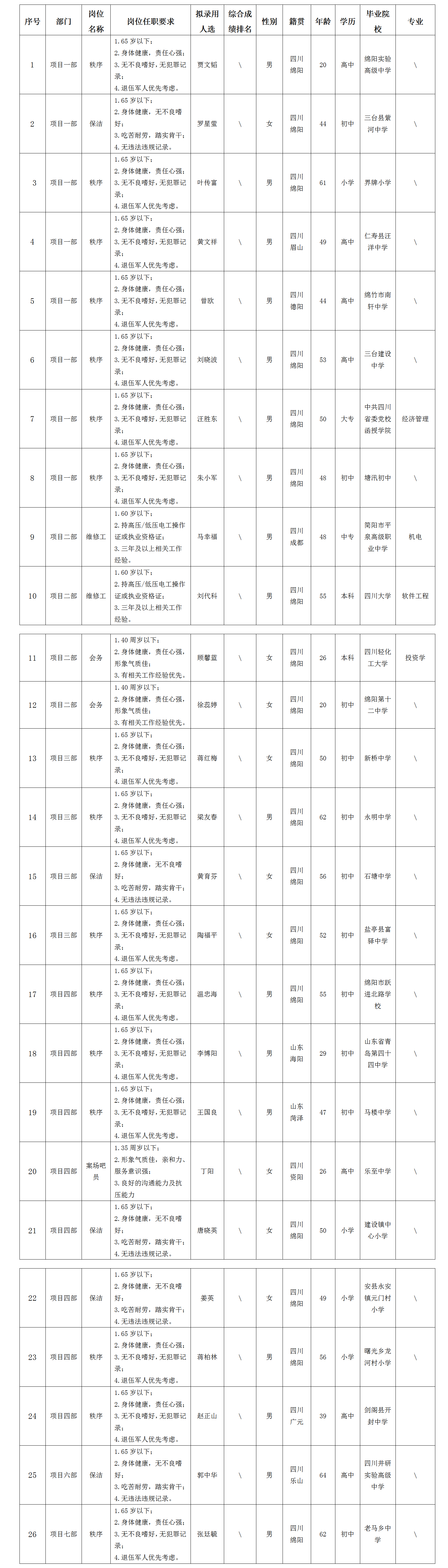 根據(jù)綿陽(yáng)市康來(lái)物業(yè)服務(wù)有限公司發(fā)布的招聘公告及招聘相關(guān)規(guī)定,經(jīng)面試等程序,擬錄用賈文韜等同志到各項(xiàng)目部工作,現(xiàn)予以公示,具體情況如下: