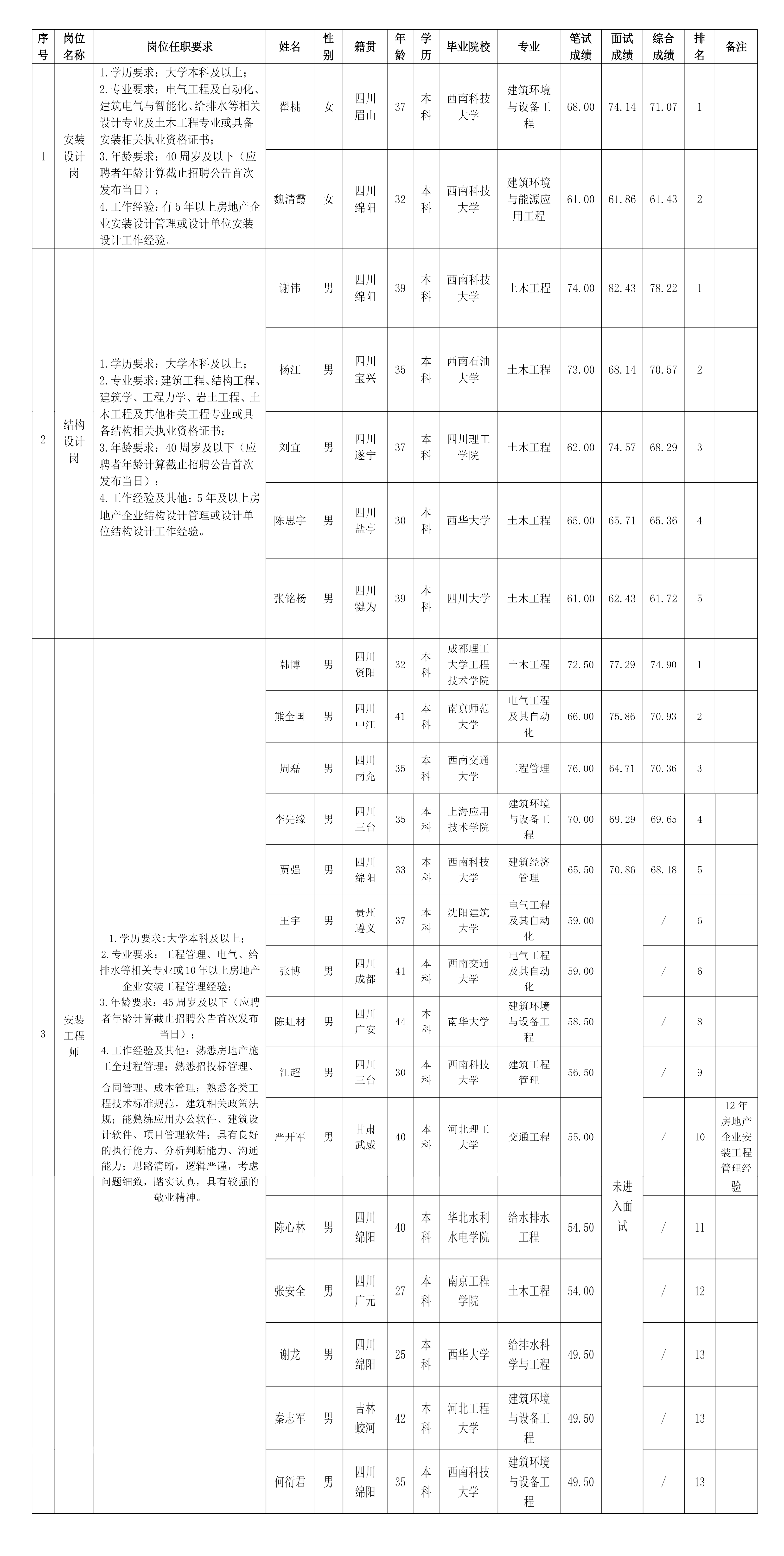 根據(jù)綿陽(yáng)市綿投置地有限公司發(fā)布的招聘公告及招聘相關(guān)規(guī)定,經(jīng)筆試、面試等程序,現(xiàn)將筆試、面試成績(jī)予以公示。