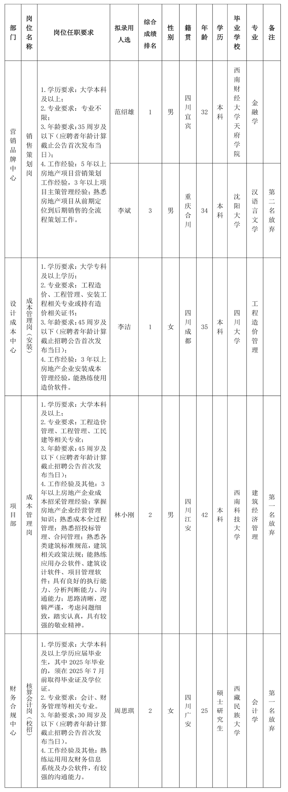 根據(jù)綿陽市綿投置地有限公司發(fā)布的招聘公告及招聘相關規(guī)定,經(jīng)筆試、面試、考察、體檢等程序,擬錄用范紹雄等5名同志到綿陽市綿投置地有限公司工作,現(xiàn)予以公示,具體情況如下: