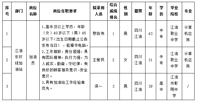根據(jù)四川綿江能源有限公司發(fā)布的招聘公告及招聘相關(guān)規(guī)定,經(jīng)面試、考察、體檢等程序,擬錄用黎百偉等3名同志到四川綿江能源有限公司工作,現(xiàn)予以公示,具體情況如下: