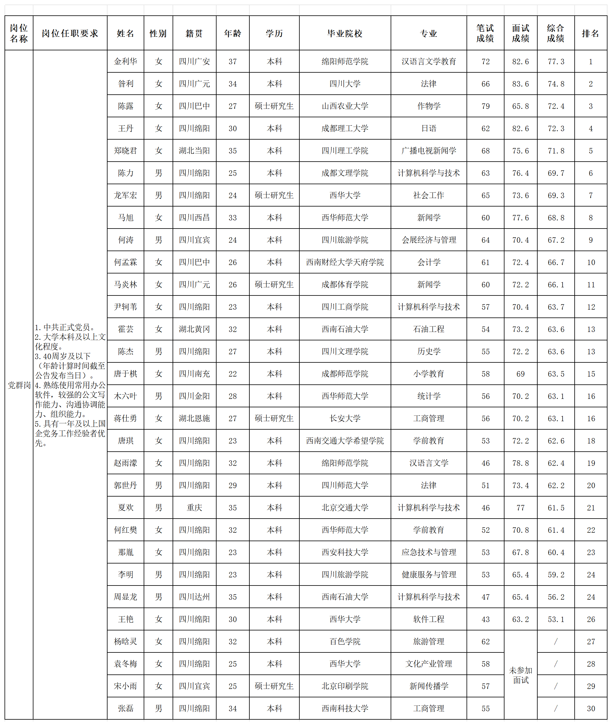 根據(jù)四川越王樓文化傳播有限公司發(fā)布的招聘公告及招聘相關規(guī)定,經(jīng)筆試、面試等程序,現(xiàn)將筆試(面試)成績予以公示。