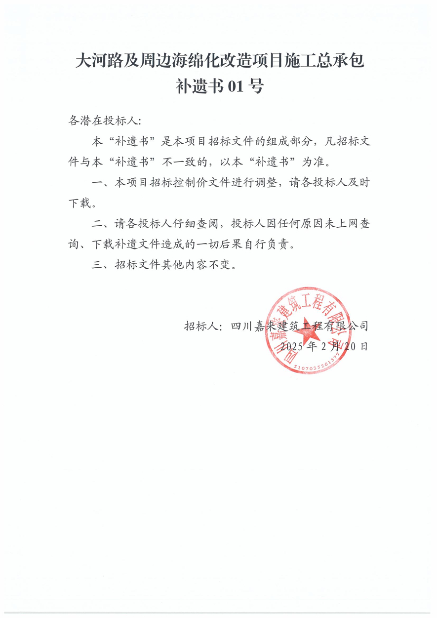 大河路及周邊海綿化改造項(xiàng)目施工總承包補(bǔ)遺書01號(hào)